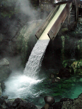 湯畑。この豪快な湯の噴き出しっぷりについうっとり。